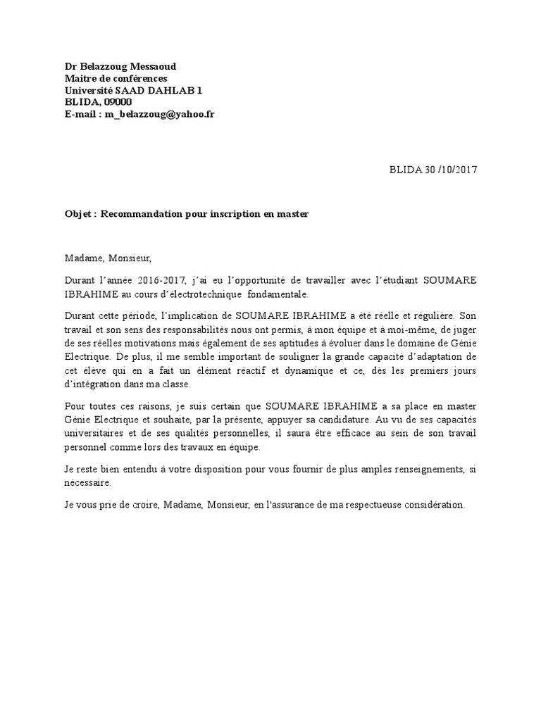 Lettre recommandation master - fr.scribd.com